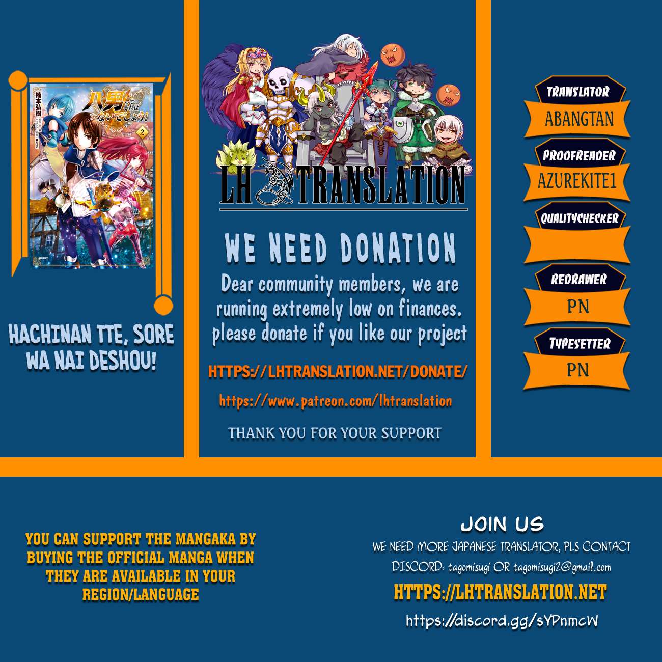 All chapters are in Hachinan Tte, Sore Wa Nai Deshou!