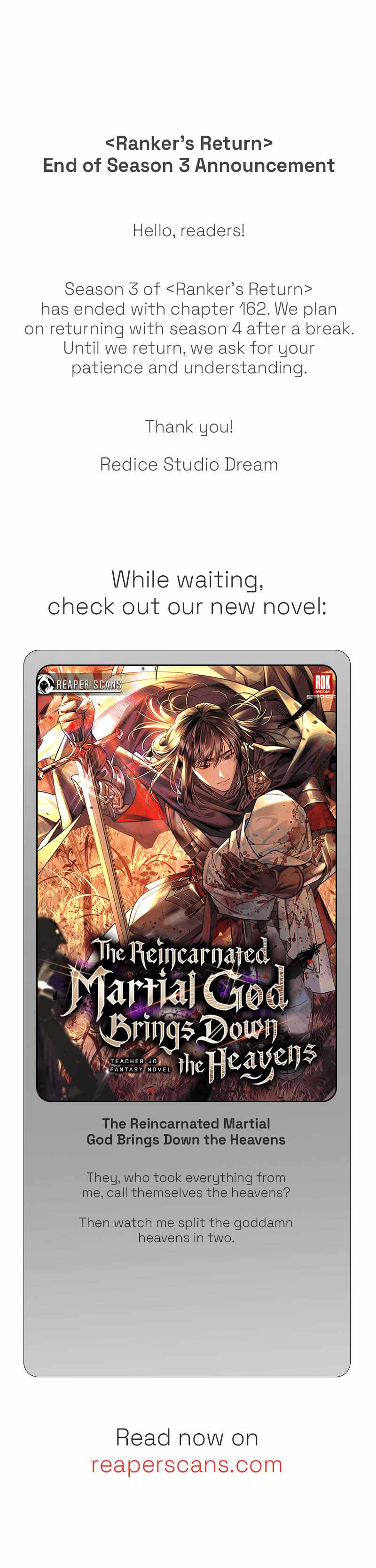 Read the latest manga Ranker’s Return (Remake) Chapter 162 at manganoads.com . Manga Ranker’s Return (Remake) is always updated at manganoads.com . Dont forget to read the other manga updates. A list of manga collections manganoads.com is in the Manga List menu.