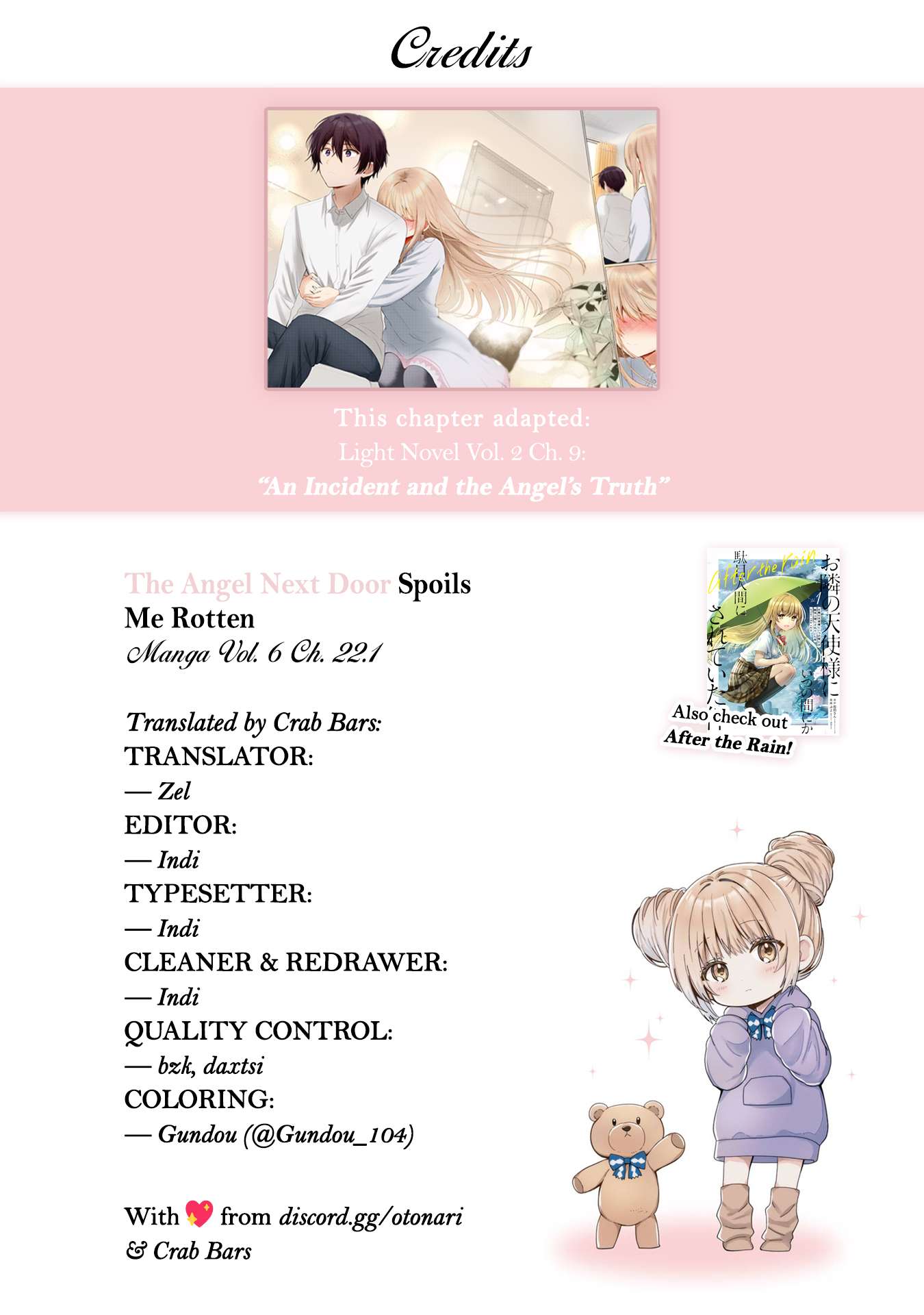 Read the latest manga The Angel Next Door Spoils Me Rotten Chapter 22.1 at manganoads.com . Manga The Angel Next Door Spoils Me Rotten is always updated at manganoads.com . Dont forget to read the other manga updates. A list of manga collections manganoads.com is in the Manga List menu.