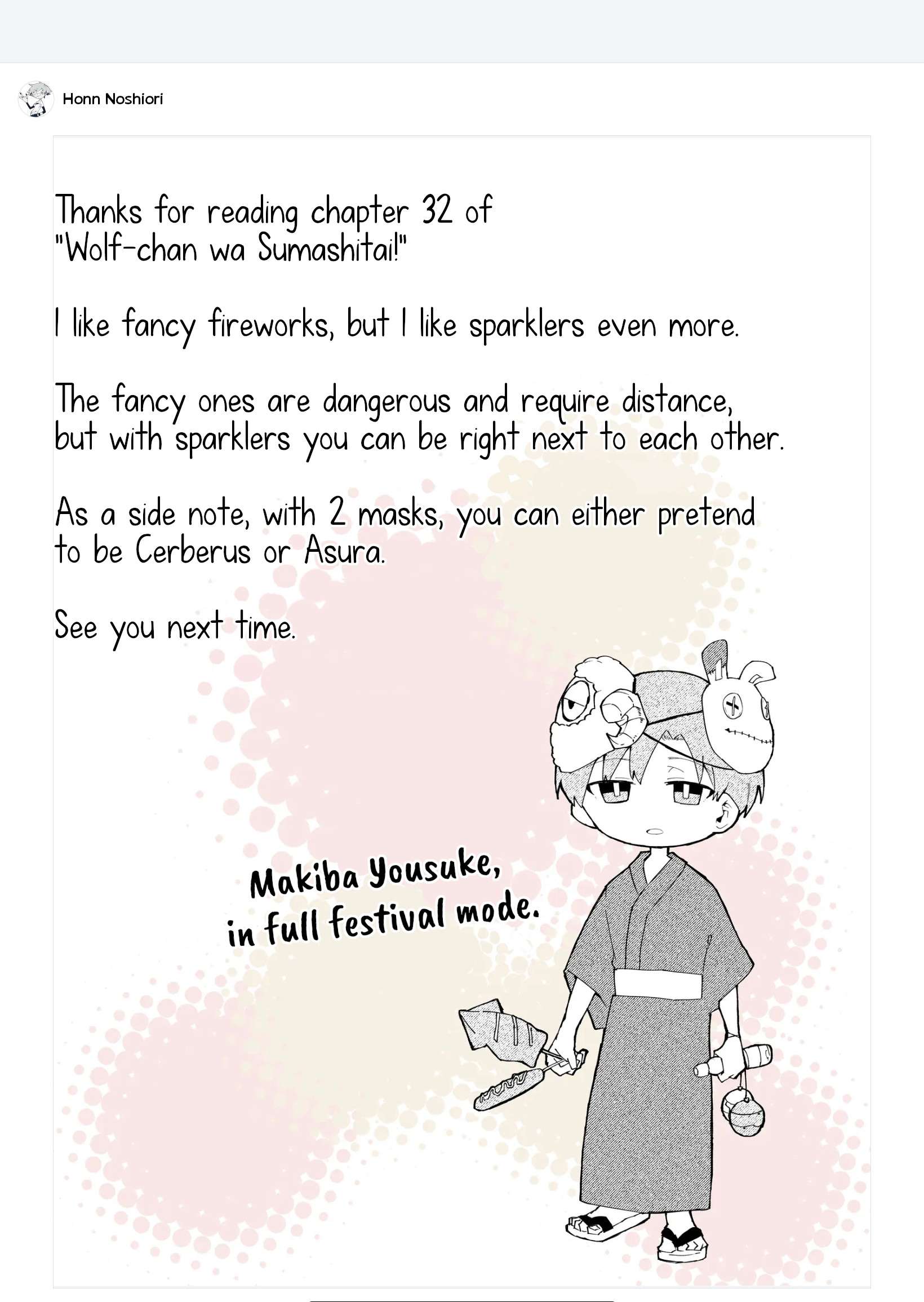 Read the latest manga Wolf-chan wa Sumashitai Chapter 32 at manganoads.com . Manga Wolf-chan wa Sumashitai is always updated at manganoads.com . Dont forget to read the other manga updates. A list of manga collections manganoads.com is in the Manga List menu.